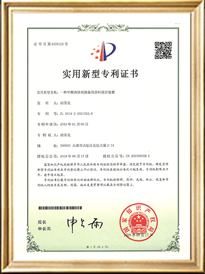• 實(shí)用新型專利證書(一種甲醛清除劑的原料存儲(chǔ)