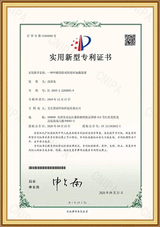 • 實(shí)用新型專利證書(一種甲醛清除劑的原料加載